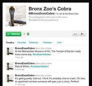 And I am somewhat relieved but sad to learn that they caught the missing Bronx Zoo Cobra – who which by the way has more than 200,000 followers. And many of the tweets from the @bronxzoocobra were both clever and hilarious. It’s good to laugh at work sometimes.